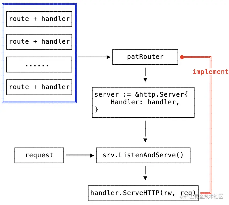 所以内置的 router 也需要实现 ServeHTTP 。至于 router 自己是怎么实现 ServeHTTP :无外乎就是寻找匹配路由,然后执行路由对应的 handle logic。