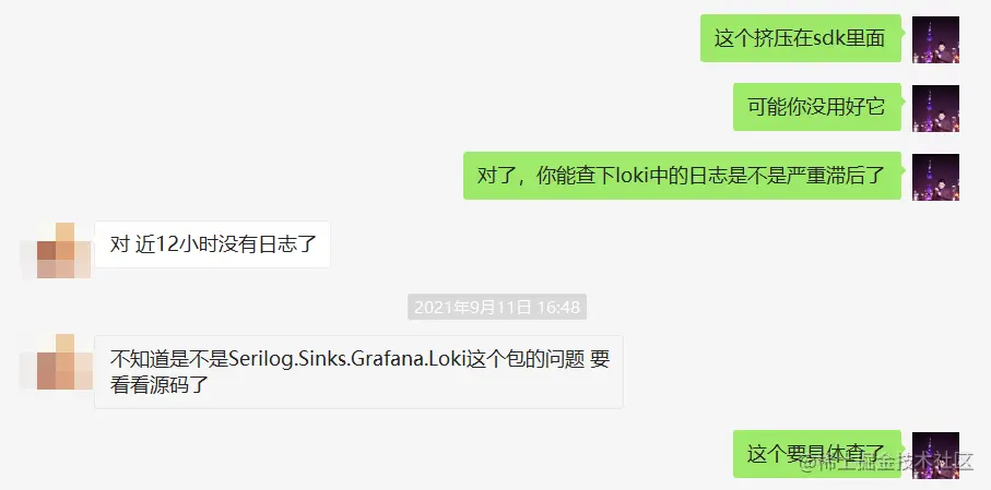 看样子这是一个失败重试,分析到这里思路大概就清晰了,就是 Grafana.Loki 或者 Serilog 组件出了什么问题,导致日志发送不到 Loki 中或者发送速度过慢,然后不断的积压所致,接下来把分析到的这些信息和朋友做了一个沟通,截图如下: