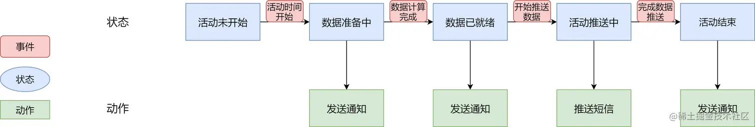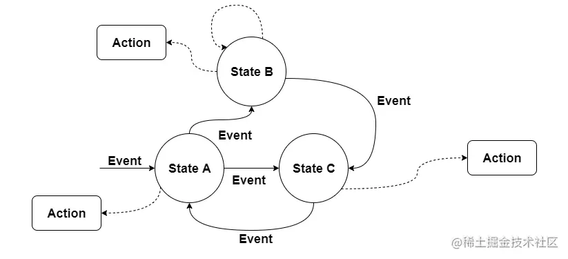 有限状态机(Finite-State Machine , 缩写:FSM),业界简称状态机。它亦是由事件、状态、动作 三大部分组成,三者的关系是:事件触发状态的转移,状态的转移触发后续动作的执行。状态机可以基于传统的状态模式硬编码来实现,也可以通过数据库/文件配置或者DSL的方式来保存状态及转移配置来实现(推荐)。