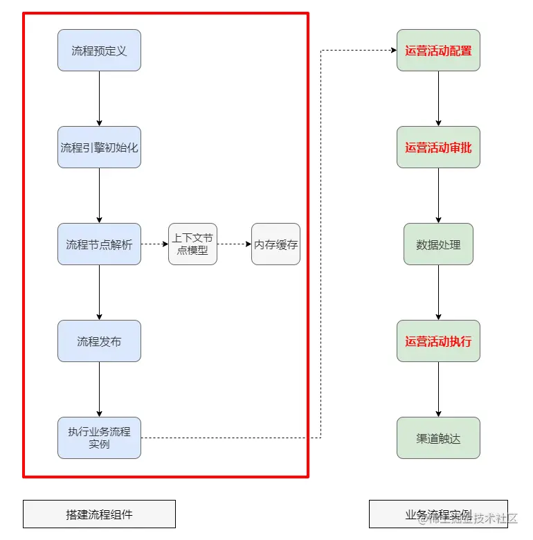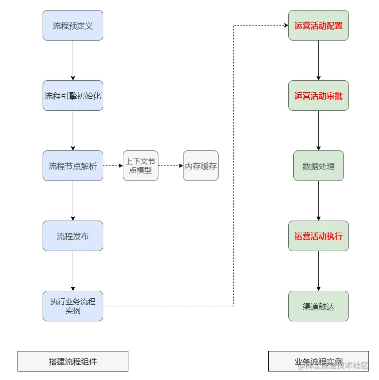 先简单介绍一下营销策略引擎:策略引擎是通过搭建可视化流程组件,定义各个流程节点,自动化执行活动业务流程,从而提供不同运营活动能力。其中核心活动业务流程主要包括三大部分:运营活动配置->运营活动审批->运营活动执行。