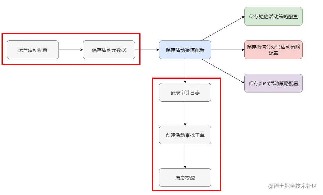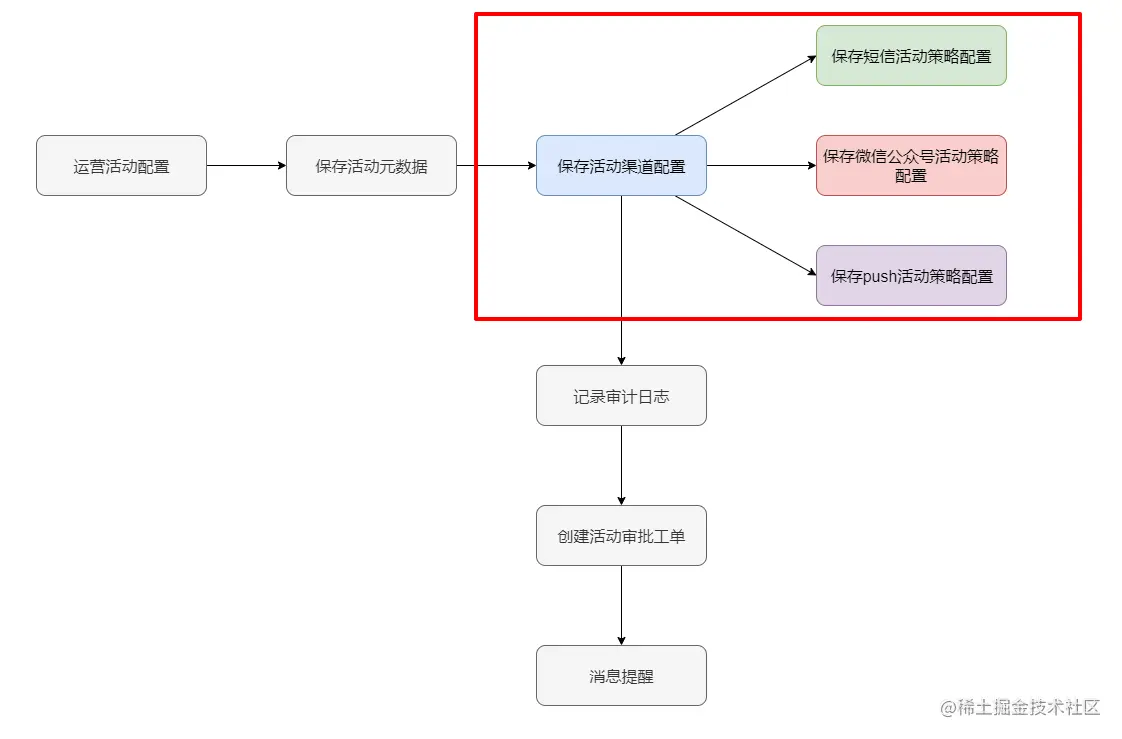 在创建不同类型运营活动策略的时候,可以发现除了保存具体活动渠道配置信息不一样之外,创建过程中很多操作流程是相同的:比如保存活动基本配置信息,审计日志上报,创建活动审批工单,创建完成后消息提醒等。