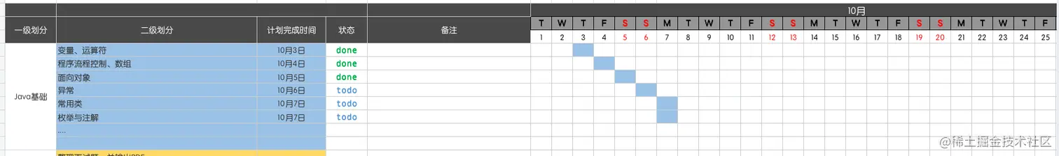 一是,计划一定要细致,拆分到切实可执行的操作单位,每个操作单位执行时间不要超过3天,比如你的计划项是学会Java基础,这个是不可操作的,因为Java基础还包含很多,最终你的这个计划项就会变得不可监控。而你把计划项列为学习Java中的变量和运算符,这样你就可以每天对你的计划项进行打卡了,你也能不断的收获到正反馈,感觉得到自己在不断打怪升级。