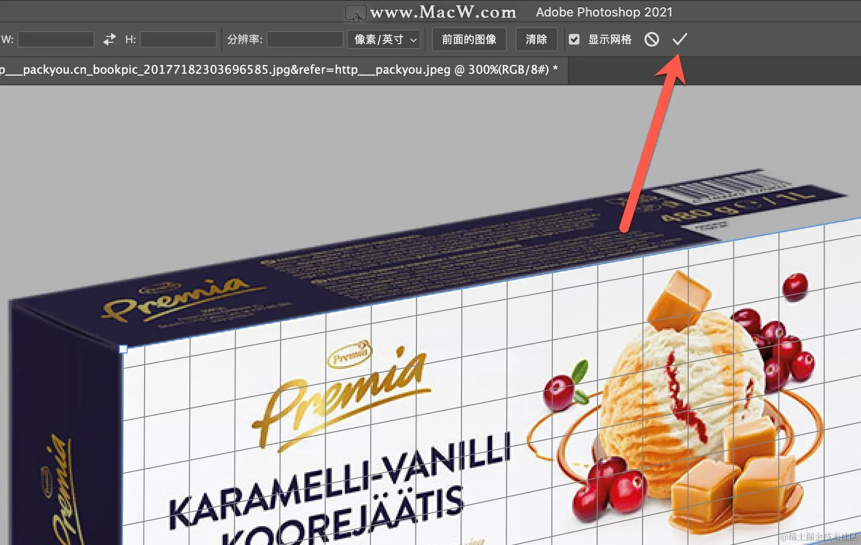 然后对包装盒正面的四个点进行单击,如果图片过小可以选择进行适当的放大,按Command和+号进行放大