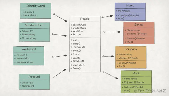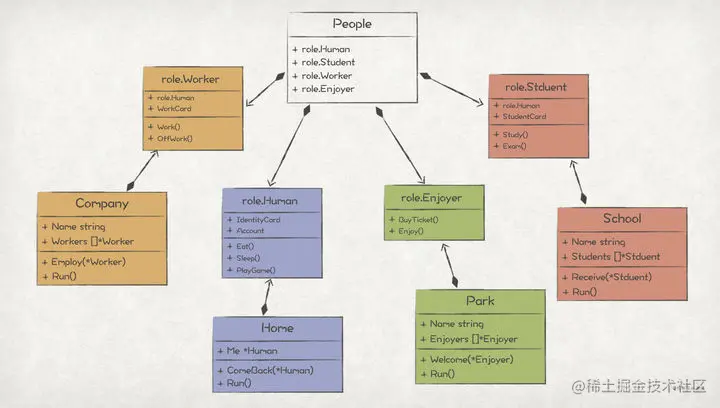 进行角色拆分之后,在实现Home、School、Company、Park等场景时,只需依赖相应的角色即可,不再需要依赖People这一领域对象: