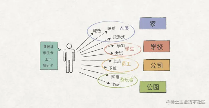 考虑一个普通人的生活日常,他会在学校上课,也会趁着暑假去公司工作,在工作之余去公园游玩,也会像普通人一样在家吃喝玩乐。当然,一个人的生活还远不止这些,为了讲解方便,本文只针对这几个典型的场景进行建模示例。