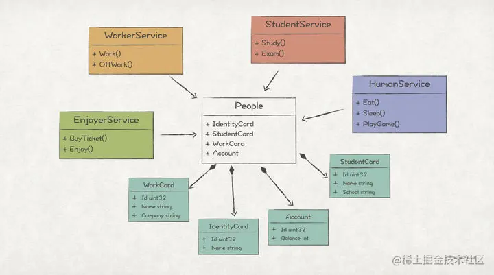 // People实现了HumanTrait、StudentTrait、WorkerTrait、EnjoyerTrait等特征接口