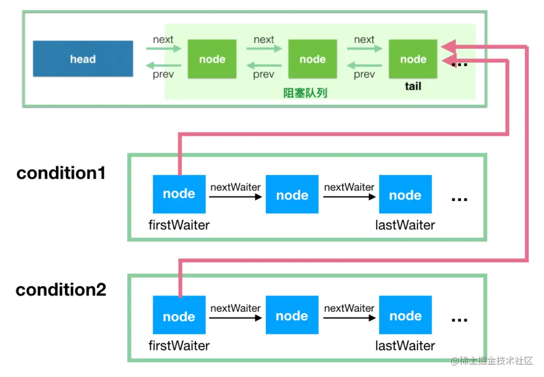 等待队列中每个线程被包装成一个 Node 实例,数据结构是链表