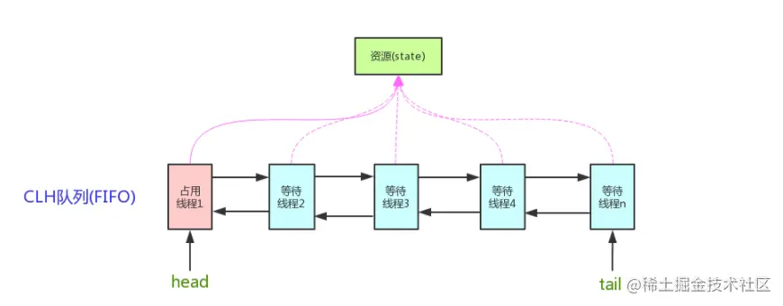 它维护了一个volatile int state(代表共享资源)和一个FIFO线程等待队列(多线程争用资源被阻塞时会进入此队列)。这里volatile是核心关键词,具体volatile的语义,在此不述。state的访问方式有三种: