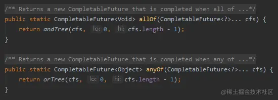 两个方法的入参都是可变参数,就是一个个异步任务。