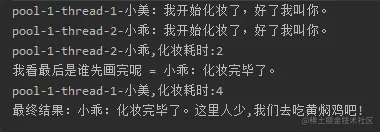 System.out.println(Thread.currentThread().getName() + "-小美,化妆耗时:" + time);
