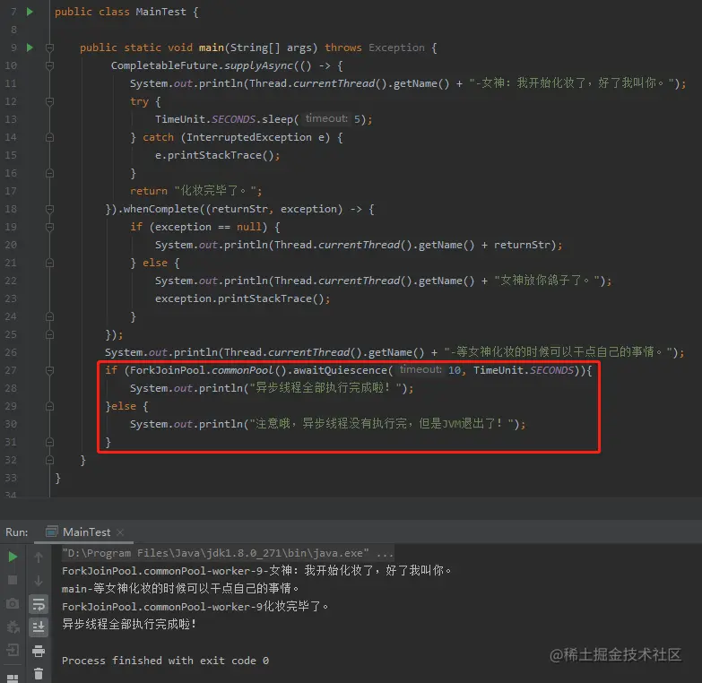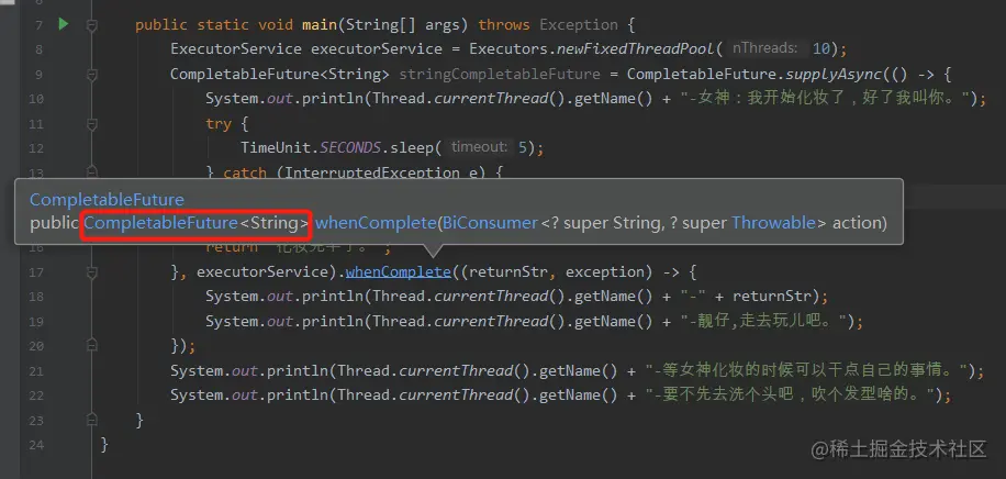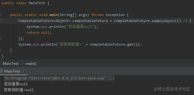 除此之外,这个方法还是带返回值的,你也完全可以像是用 Future 那样通过 get 获取其返回值: