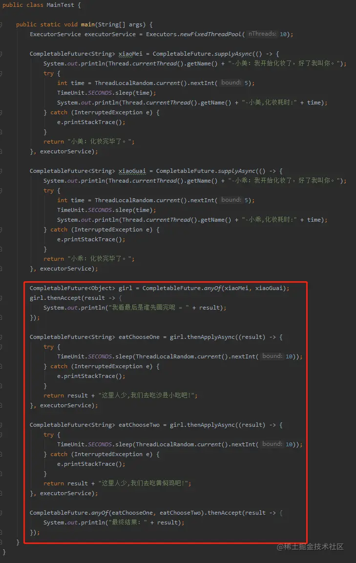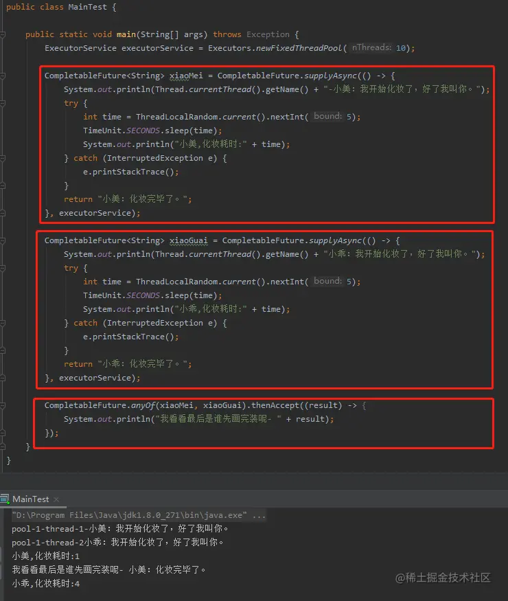 CompletableFuture<Object> girl = CompletableFuture.anyOf(xiaoMei, xiaoGuai);