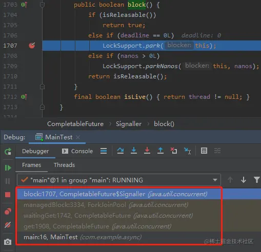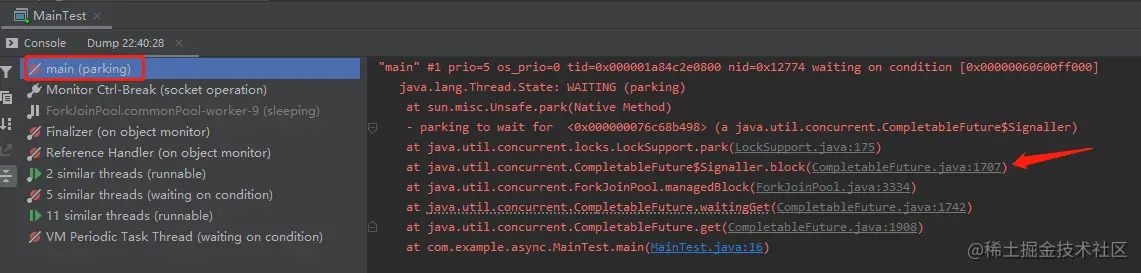 你仔细看我框起来的地方,是 main 线程开始获取结果,获取结果的这个动作把 main 线程给阻塞住了。