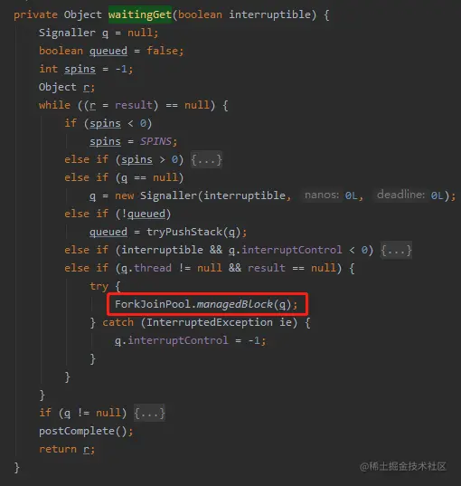 其实就在 waitingGet 的 while 循环的最后一个分支里面,也就是我框起来的部分: