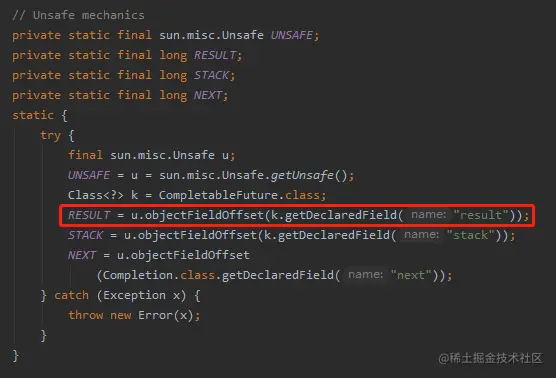 框起来的代码,目的是为了获取 CompletableFuture 类中的 result 字段的偏移量,并用大写的 RESULT 存储起来。