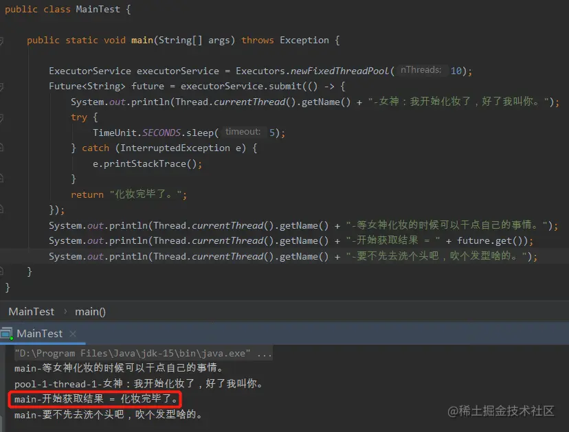 还是拿前面的代码做演示,这个代码你跑起来之后,主线程由于调用了 get 方法,那么势必会阻塞等待异步任务的结果: