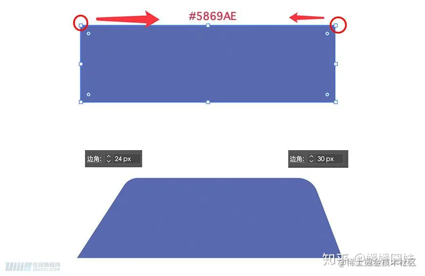 然后分别给梯形上面的两个角加圆角,分别是 24px 和 30px