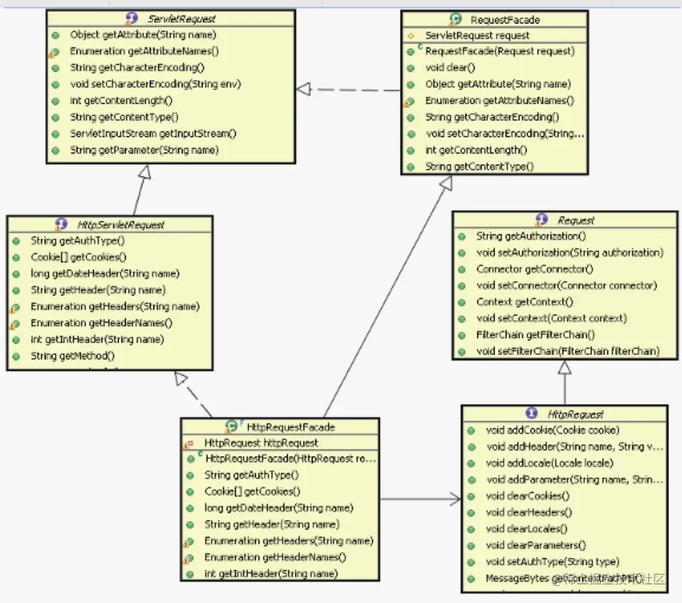 从图中可以看出 HttpRequestFacade 类封装了 HttpRequest 接口能够提供数据,通过 HttpRequestFacade 访问到的数据都被代理到HttpRequest 中,通常被封装的对象都被设为 Private 或者Protected 访问修饰,以防止在 Façade 中被直接访问。