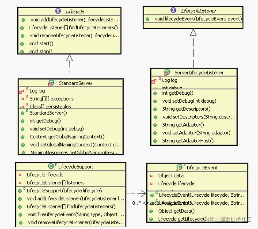 Lifecycle 接口代表的是抽象主题,它定义了管理观察者的方法和它要所做的其它方法。而 StandardServer 代表的是具体主题,它实现了抽象主题的所有方法。这里 Tomcat 对观察者做了扩展,增加了另外两个类:LifecycleSupport、LifecycleEvent,它们作为辅助类扩展了观察者的功能。
