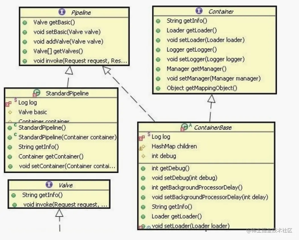 上图基本描述了四个子容器使用责任链模式的类结构图,对应的责任链模式的角色,Container 扮演抽象处理者角色,具体处理者由StandardEngine 等子容器扮演。与标准的责任链不同的是,这里引入了 Pipeline 和 Valve 接口。他们有什么作用呢?