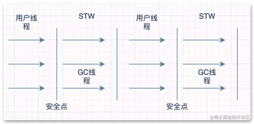 - 抢先式中断:就是在stw的时候,先让所有线程「完全中断」,如果中断的地方不在安全点上,然后「再激活」,「直到运行到安全点的位置」再中断。