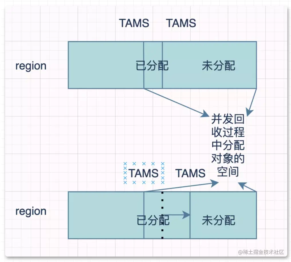 G1 垃圾回收器把堆划分成一个个「大小相同的Region」,每个 Region 都会扮演一个角色,H、S、E、O。E代表伊甸区,S代表 Survivor 区,H代表的是 Humongous(G1用来分配「大对象的区域」,对于 Humongous 也分配不下的超大对象,会分配在连续的 N 个 Humongous 中),剩余的深蓝色代表的是 Old 区,灰色的代表的是空闲的 region。在 HotSpot 的实现中,整个堆被划分成2048左右个 Region。每个 Region 的大小在1-32MB之间,具体多大取决于堆的大小。在并发标记垃圾时也会产生新的对象,G1 对于这部分对象的处理是这样的:将 Region 「新增一块并发回收过程中分配对象的空间」,并为此设计了两个 TAMS(Top at Mark Start)指针,这块区域专门用来在并发时分配新对象,有对象新增只需要将 TAMS 指针移动下就可以了,并且这些「新对象默认是标记为存活」,这样就「不会干扰到标记过程」。