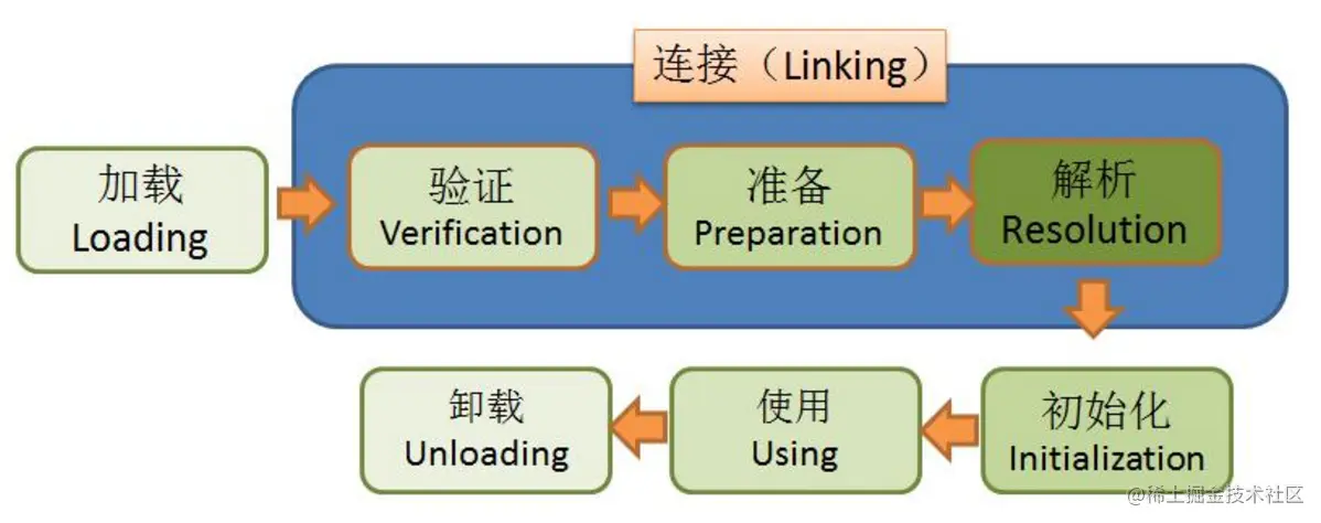 真实情况是加载、验证、准备、初始化、卸载这五个阶段的顺序是确定的,是依次有序的。但是解析阶段有可能会在初始化之后才会进行,这是为了支持 Java 动态绑定的特性。