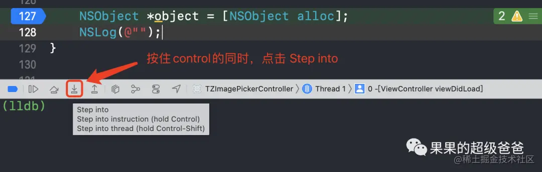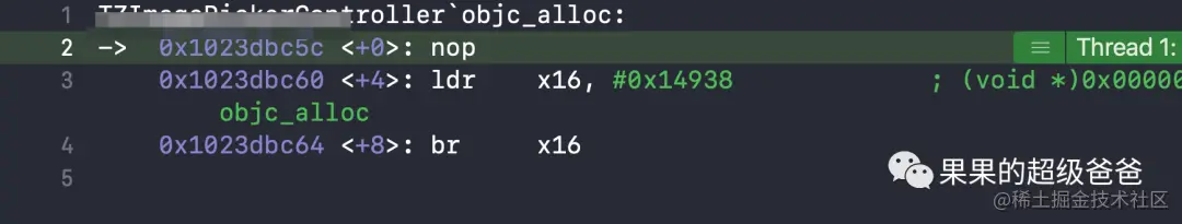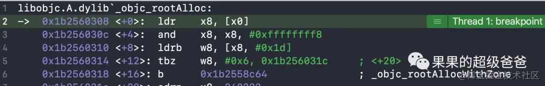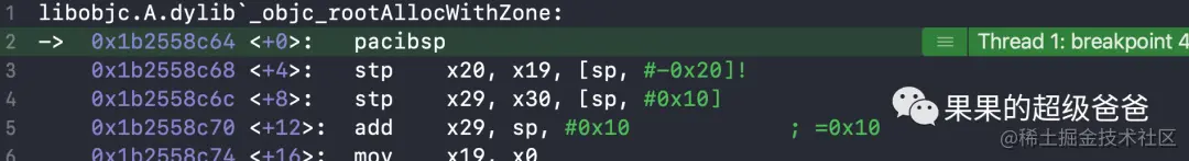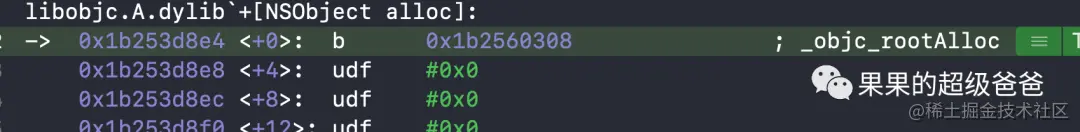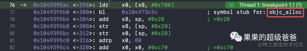 1、在对应的alloc方法处打断点,进入之后再添加一个符号断点alloc往下执行