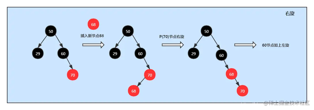 - 右旋:以某个节点作为支点(旋转节点),其左子节点变为旋转节点的父节点,左子节点的右子节点变为旋转节点的左子节点,右子节点保持不变