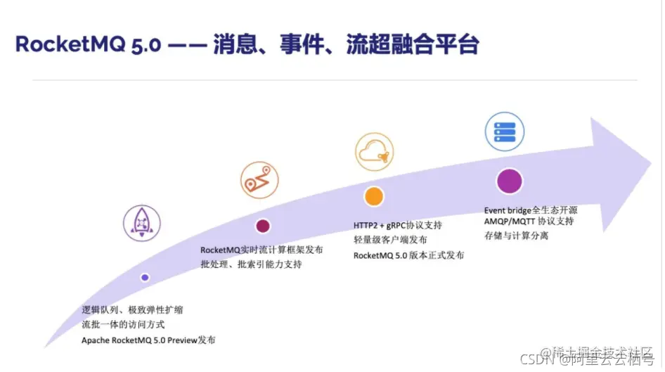 RocketMQ 5.0 版本将在今年正式发布, 5.0 Preview 的版本已经在 Discuss 了,代码也放在 Github 仓库中,5.0 Preview 版本会推出逻辑队列,以及流批一体的访问方式等重磅特性。之后我们会正式发布实时流计算框架 RocketMQ Streams,并在 RocketMQ 5.0 支持批处理、批索引能力。在后续的里程碑中 RocketMQ 5.0 将会完成 gRPC 协议支持,全新的轻量级客户端,完成 AMQP、MQTT 协议等支持,以及可分可合的存储与计算分离架构。