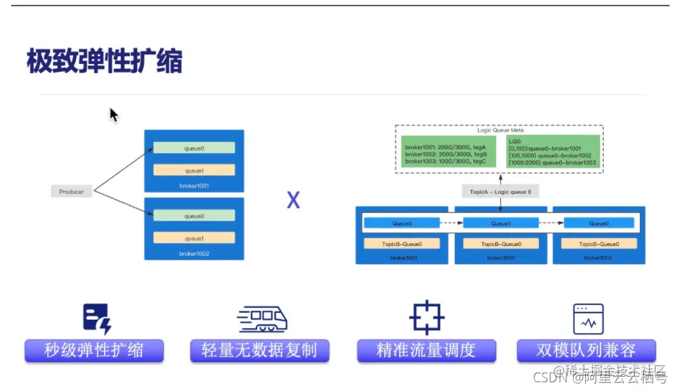 由于逻辑队列是一个 Binding 过程,所以是非常轻量级的操作,因此提供了一个秒级弹性扩充的一个能力,过程中完全没有也没有数据的复制,只要一完成 Broker 扩容,完成绑定操作,流量也就完成了调拨。另外我们也提供双模队列兼容的能力,平时默认还是原来的物理队列,只有指定单个 Topic 开启后,才会使用逻辑队列。