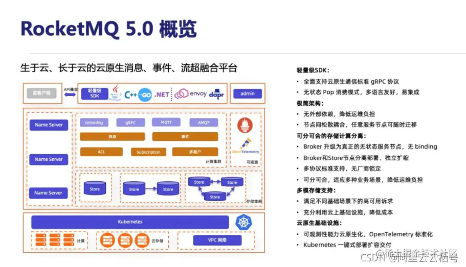 RocketMQ 5.0 作为云原生的消息事件流的超融合平台,基于架构图我们一一进行讲解: