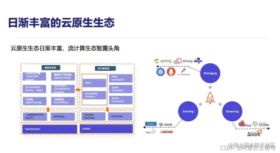 另一方面,在实时计算生态上面,RocketMQ 也积极的和其他的大数据框架进行对接,包括 Flink、Spark 等 。特别是基于最新标准的 RocketMQ-Flink Connector 也会近期毕业。