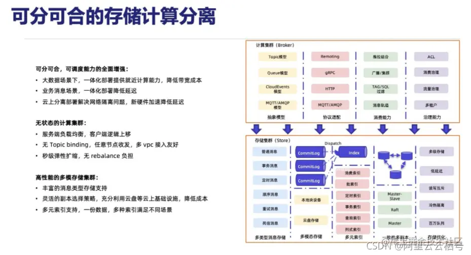 因此 RocketMQ 5.0 将会提供可分可合的存储计算分离架构,可以适应多种场景。计算节点是完全无状态的。包括像协议适配、流量租户等管控都会放在计算节点上完成。此外,通过 POP 消费方式把整个客户端的负载均衡逻辑位的管理上升到计算节点,无 Queue Binding,任意的计算节点都能进行收发。另外,由于无状态,可以完成秒级弹性扩缩,并且过程中是没有 Rebalance 负担的。