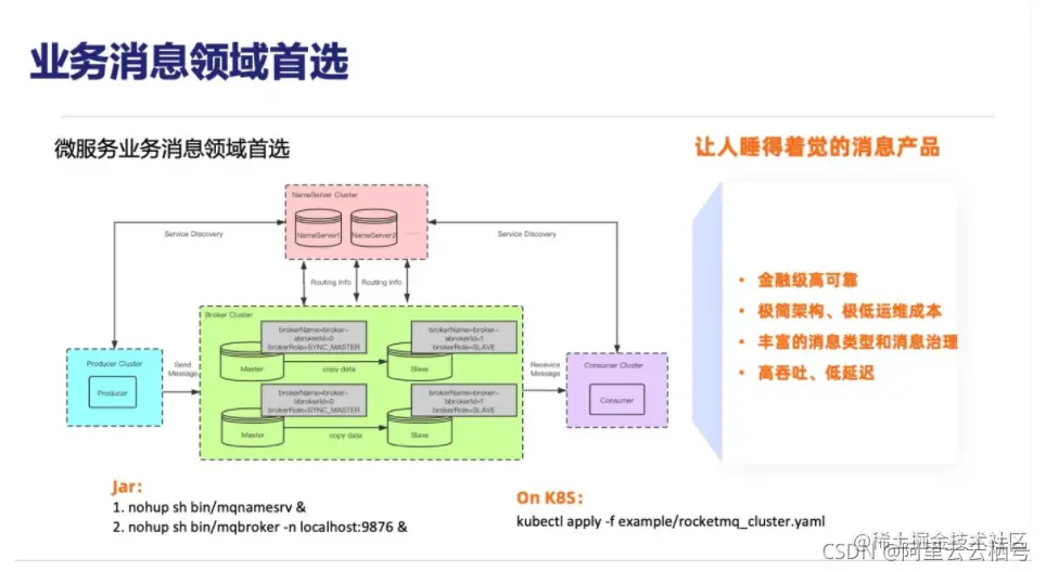RocketMQ 部署也非常简单,JAR 部署只需要两行命令就能把 RocketMQ 进行拉起。在 K8s 上部署就更加简单,如果用了 RocketMQ Operator ,用一句 kubectl apply 命令就能将整个集群拉起来。