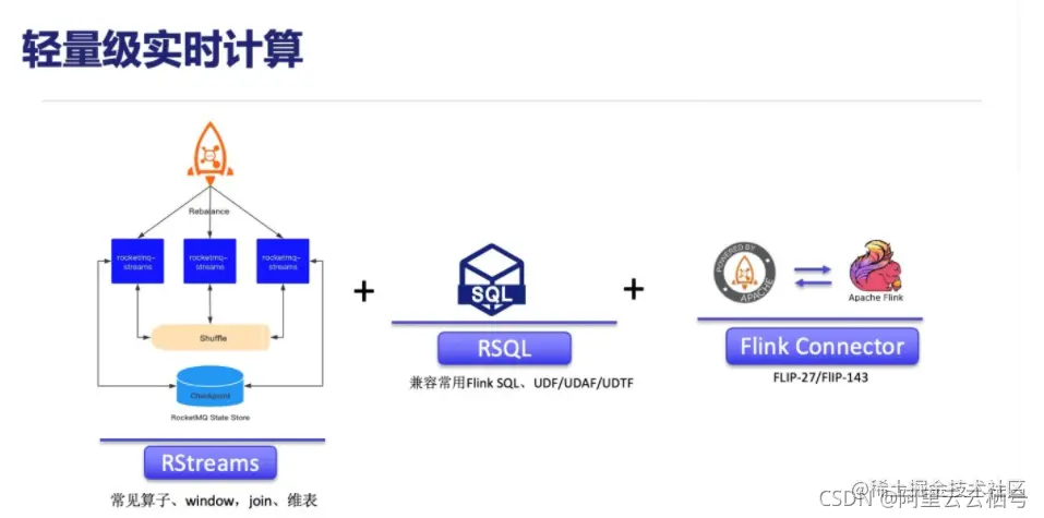 RocketMQ Stream 依赖少、部署简单,它利用 RocketMQ Rabalance 能力可以任意横向扩展,同时支持包括 Map、Fliter 这些常见的算子,还有 Window、Join、维表等。另外相比于其他基于消息的实时计算平台,RocketMQ Streams 除提供原生无依赖的支持外,可以兼容 Flink SQL 标准以及提供 UDF/UDAF/UDTF 的能力。