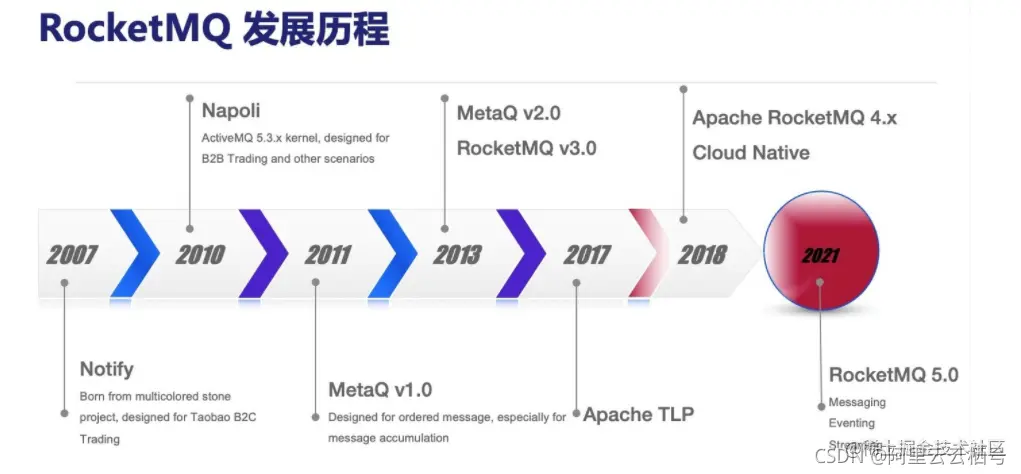 所以在2011年,阿里巴巴以文件系统作为存储研发了 MetaQ。经过不断探索,在重写 MetaQ 2.0 后,第一代 RocketMQ 正是诞生,并将其命名为 RocketMQ 3.0 。2013年,阿里巴巴对 RocketMQ 进行开源,并在2016年捐献给 Apache 社区。2017年,RocketMQ 从 Apache 毕业,正式成为 Apache 基金会顶级开源项目。
