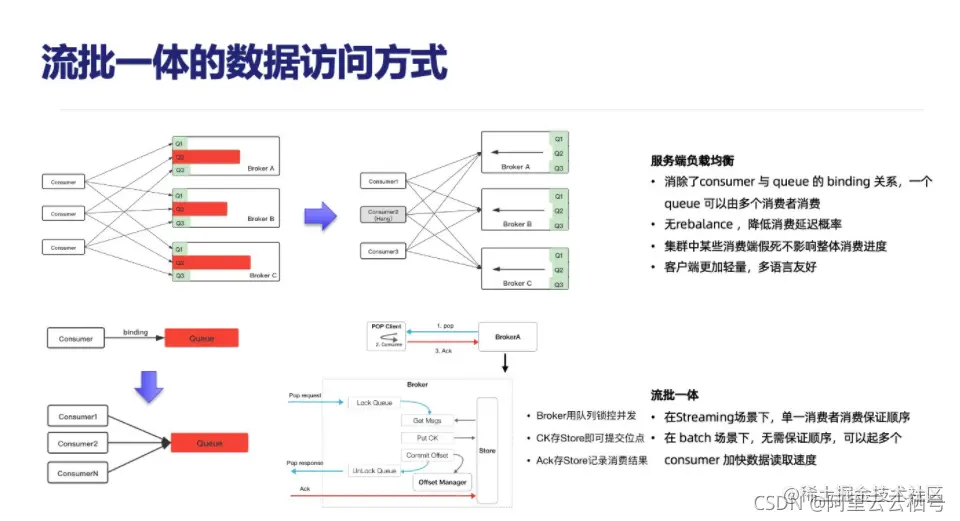 有了 POP、PUSH、PULL 等模式之后,RocketMQ 就可以完成流批一体的数据访问方式。比如说在 Streaming 场景下,通过原本 PUSH 方式可以保证很好的顺序消费。但批处理等对顺序要求并不高的场景中,我们可以用 POP 消费的方式对同一队列进行高并发读取,加快数据读取速度。另一方面 POP 消费模式也使得客户端更加轻量化,大量的逻辑都在服务端,对多语言客户端的编写也是更加友好的。