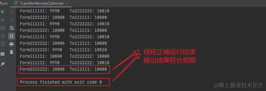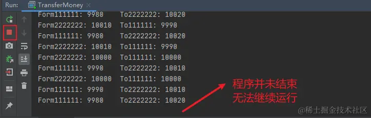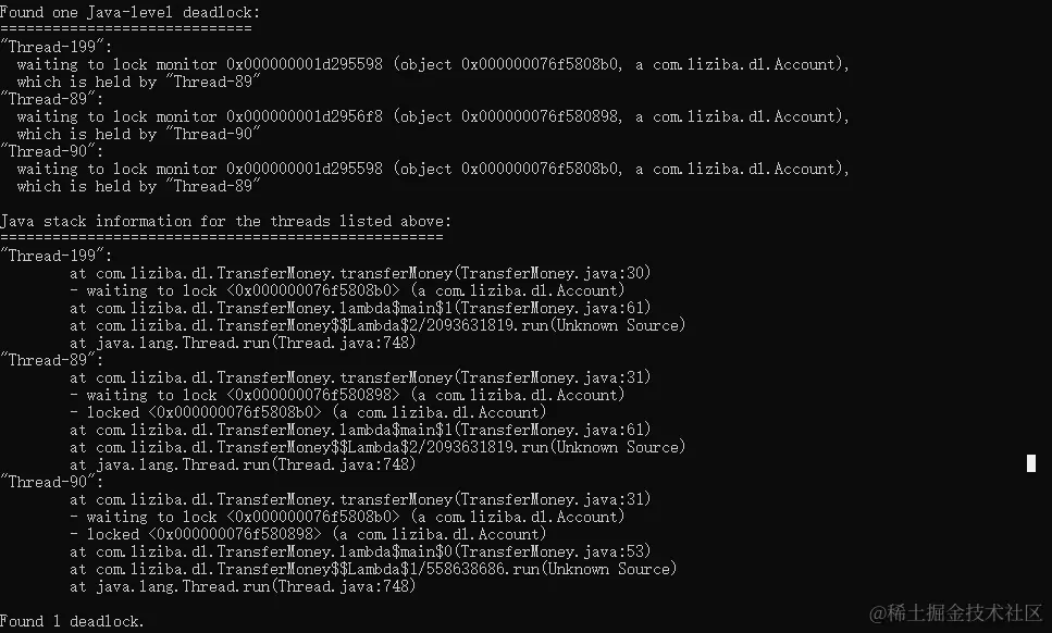 上面这个类看似规定了锁的顺序由accountFrom到accountTo不会产生死锁,但是这个accountFrom和accountTo是由调用方来传入的,当A向B转账时accountFrom = A,accountTo = B;当B向A转账时accountFrom = B,accountTo = A;假设两者在同一时刻给对方发起转账,则仍然存在3.1中锁顺序死锁问题。比如如下测试: