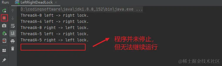 产生这种情况的原因,是不同的线程通过不同顺序去获取相同的锁;比如线程1获取锁的顺序是left -> right,而线程2获取锁的顺序是right -> left,在某种情况下会发生死锁。拿上面的案例分析,我们通过Java自带的jps和jstack工具查看java进程ID和线程相关信息。