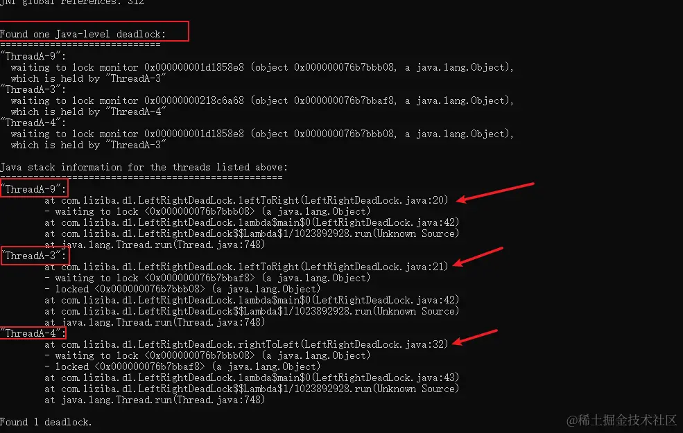 jstack查看进程中的线程信息,线程信息比较多,我把重要的复制出来,如下的图中能很明显的看到产生了死锁。