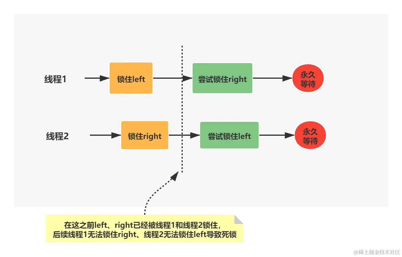 如上所示的这两种情况无法避免同时执行的情况,因此存在死锁的可能性,其执行流程如下: