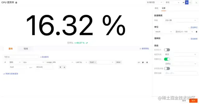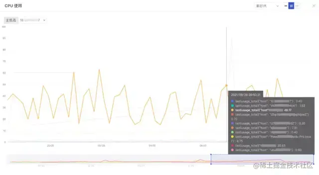 矩形树图用于展示不同分组下指标数据的占比分布可视化。如本图中通过可视化的方式展示主机的CPU使用率排名。点击排在第一位的主机,即可查看图表的DQL查询语句、设置的链接以及关联查询相关日志、容器、进程、链路、主机监控视图等。