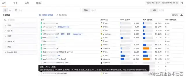 查询范围绝对时间,默认展示最近24小时的主机数据、最近十分钟内的容器数据、最近十分钟的进程数据,可通过手动方式刷新查询范围。鼠标悬停在离线的主机,可查看主机离线处理提示。