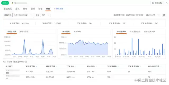 主机网络性能监测支持查看主机服务、容器和任意带标签的基础设施等之间的网络流量。支持基于 IP/端口查看源主机到目标之间的网络流量和数据连接情况,通过可视化的方式进行实时展示,帮助企业实时了解业务系统的网络运行状态,快速分析、追踪和定位问题故障,预防或避免因网络性能下降或中断而导致的业务问题。