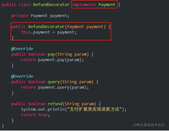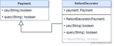 我们把Payment类作为RefundDecorator的一个属性注入就来,这样就可以使用Payment类的pay()和query()两个方法了
