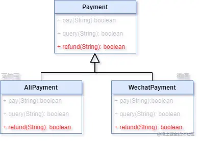 在Payment接口类上增加退款方法,意味着这上百个支付方式的类都要去实现这个方法,否则代码就编译报错