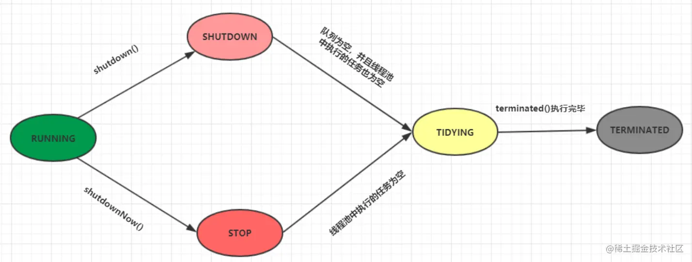 该状态的线程不会接收新任务,也不会处理阻塞队列中的任务,而且会中断正在运行的任务;