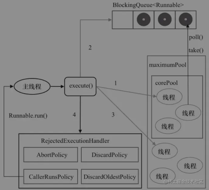 如果当前的线程数达到了maximumPoolSize,还有新的任务过来的话,直接采用拒绝策略处理。
