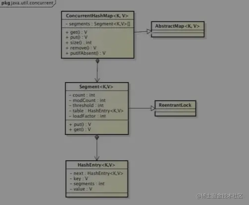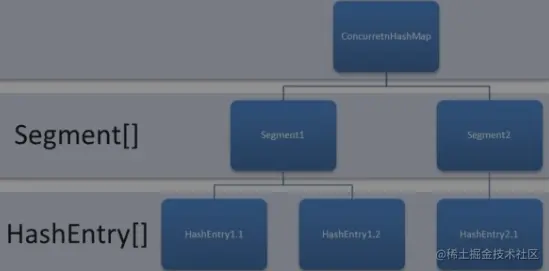 核心有Segment数组结构和HashEntry数据结构构成,Segment是ReentrantLock可重入锁,HashEntry用于存储键值对,存在于Segment中。